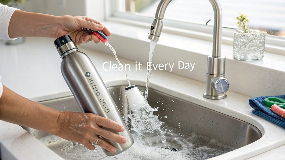 Daily water bottle cleaning, especially after direct drinking, prevents buildup of bacteria like Pseudomonas and E. coli.
