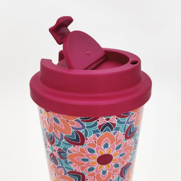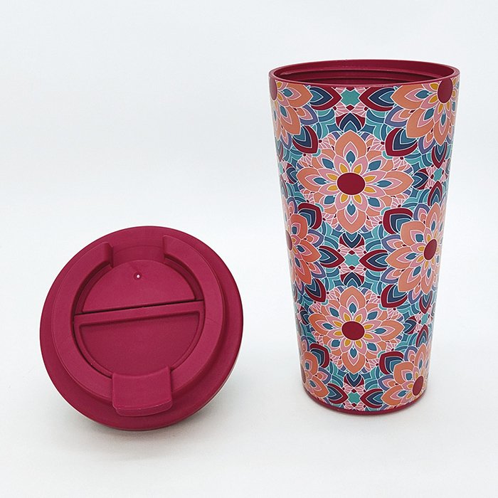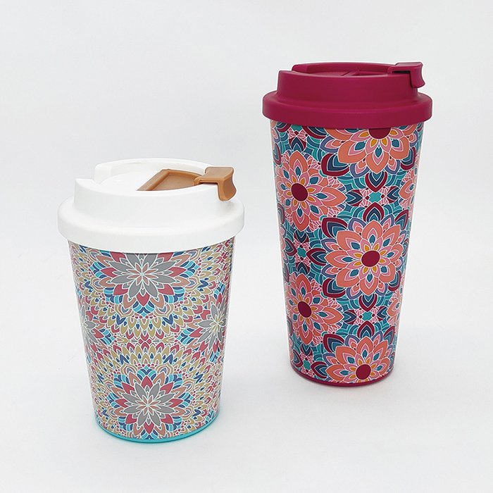 The tapered shape makes it easy for us to take on the go and the twisted lid prevents any spills. We can print beautiful patterns onto this mug to make it useful and stylish.